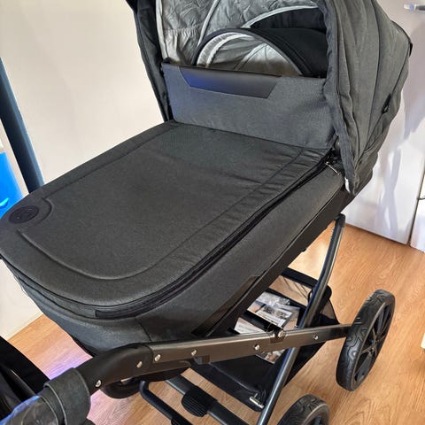 Stork klapvogn i sort farve. Indeholder liggedel med polstret indre i lys farve. Stel i sort med store hjul. Designet til at give komfort og funktionalitet til barnet under transport.