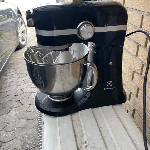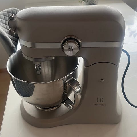 Electrolux EKM 4000 køkkenmaskine med rustfri stål skål og tilbehør til blanding og æltning. Maskinen har en hvid krop med metalhåndtag og elektrisk tilslutning. Velegnet til hjemmebrug til forskellige køkkenopgaver.