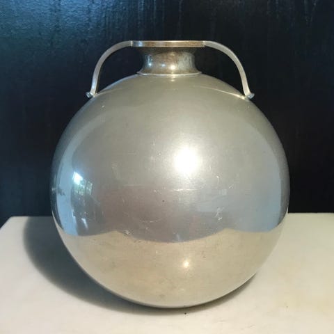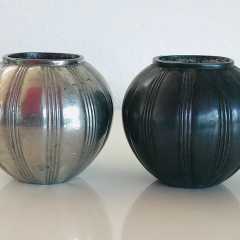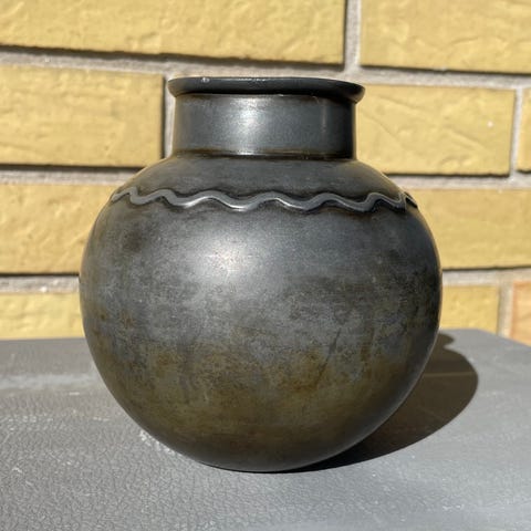 Dejlig tyk fiskevase af diskometal. Design Just Andersen med ca 100 år på bagen. Rigtig pæn stand med lidt alderssvarende overfladebrugsspor og patina. Meget tung med en vægt på over 1 kilo. Fremstår uden vanlig brunering. Ca. mål: 9,5 x 12 x 8 cm.