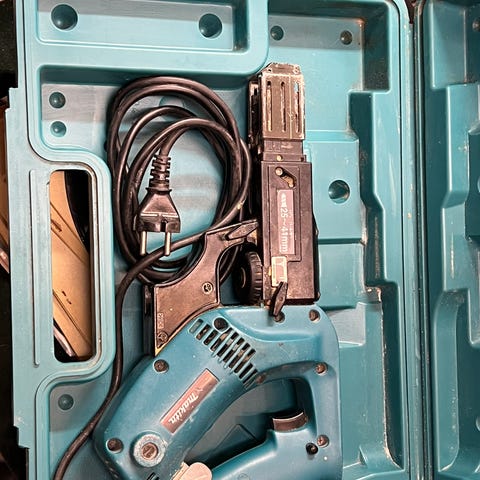 Falke gibsskruemaskine er næsten ikke brugt og sælges med en pakke skruer fra NKT med ca. 600 skruer.