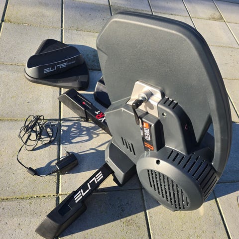 Elite Suito-T hometrainer med 11 speed ultegra kassette og elite sterzo smart forhjul støtte. Der følger adapter med til 10 speed samt adapter til thru aksel samt forhjuls støtte. Kan bruges til Zwift,Bkool og masser andre platforme. Benene kan nemt klappes ind langs siden så den kan ikke fylder så meget.