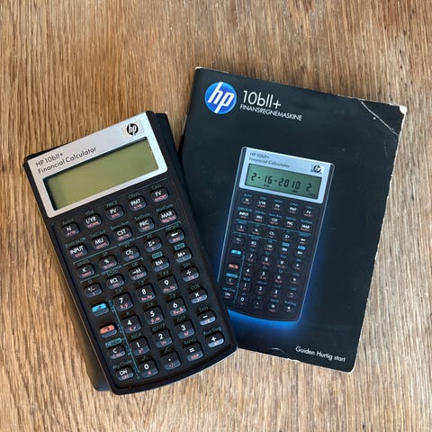 HP-16C Hewlett-Packard lommeregner med tilhørende brugervejledning og beskyttelsesetui.