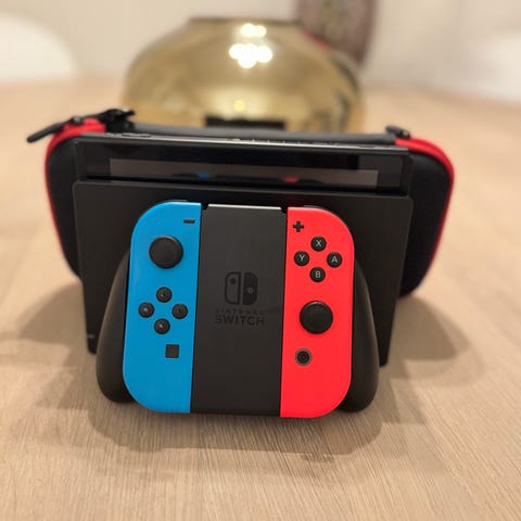 Nintendo Switch konsol med hvide Joy-Con og spil