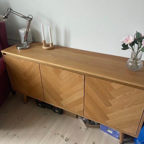 Formen på skænken gør den let at placere, uanset om det er i stuen, spisestuen eller entréen. De bløde linjer og naturlige nuancer falder naturligt ind i rummet og skaber en harmonisk atmosfære. Materialevalget giver møblet karakter og sikrer, at det står stabilt uden at virke tungt, hvilket gør det nemt at indrette omkring.