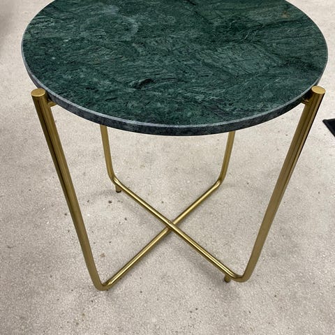 Lille marmorbord til en lille hyggelig bordlampe og billeder. Måler 40 cm i længden, 40 cm i dybden og 45 cm i højden.