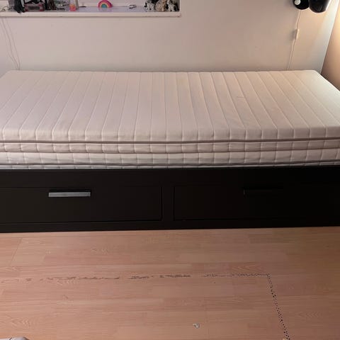 Sort Brimnes sengestel fra IKEA i str. 80 x 200. Få brugsspor. Stellet har 2 rumlige skuffer og er delvist skilt ad, så den er nem at samle igen. To madrasser med betræk, der kan lynes af og vaskes, kan medfølge.