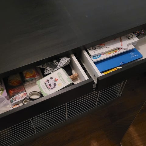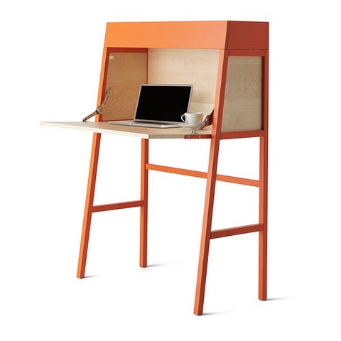 Smart skrivebord der kan lukkes så det fylder mindre. Når det er slået ned er der masser af bordplads, og et hul inde i hjørnet til kabler.