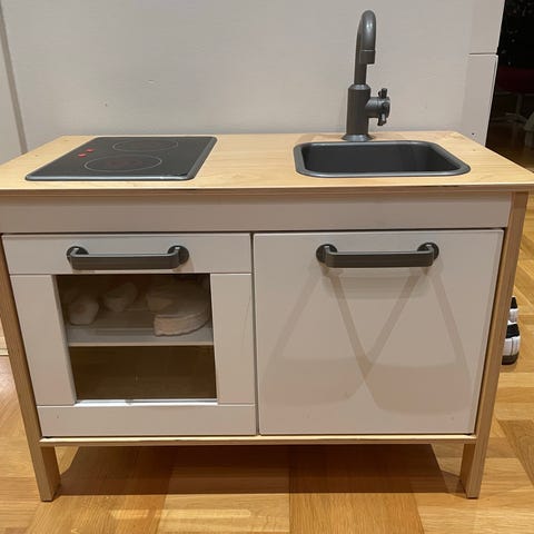 Børnekøkkenet har en ovn med glaslåge, en vask med hane og en kogeplade. Materialet er primært træ og plastik. Velegnet til leg og læring for børn.