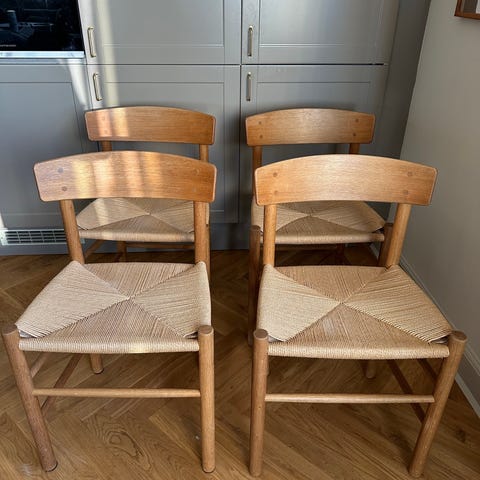 Stolene er produceret i massiv egetræ, med flettet sæder.