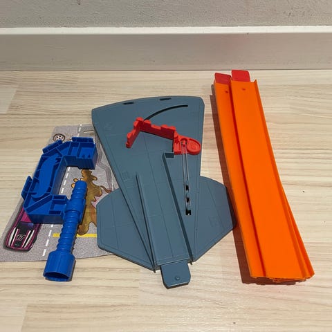 Hot Wheels legesæt med flere dele til baneopbygning. Indeholder bøjede og lige banestykker i sort og orange, samt forskellige tilbehørskomponenter til at skabe udfordrende racerbaneelementer. Materialet er plastik, og sættet er designet til børn. Kan sættes sammen på forskellige måder og er kompatible med øvrige Hot Wheels baner. Alle dele på billedet medfølger og sælges samlet.