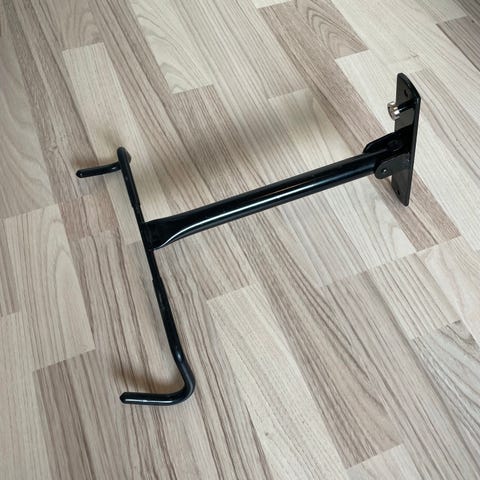 Vægmonteret cykelophæng i metal med rød polstring på holderne. Designet til opbevaring af cykler på væggen, hvilket sparer gulvplads. Passer til forskellige cykeltyper og er velegnet til opbevaring i hjemmet eller garage.