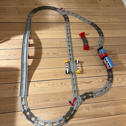 LEGO DUPLO damptog med skub-og-kør-motor. Et blidt skub enten frem eller tilbage sender toget på vej, og hvis det holdes fast eller løftes af skinnerne, stopper det. Indeholder 5 farvede funktionsklodser som kan placeres langs sporet for at tude i hornet, tænde og slukke for lysene, holde pause og tanke op, skifte retning og standse toget, hvor det passer bedst. Fejler intet og alt medfølger.