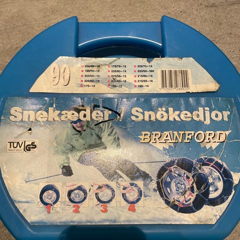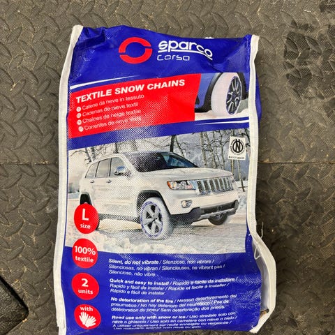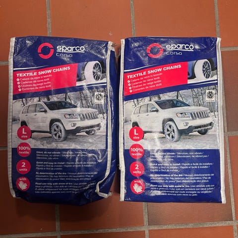 Textile Sneekæder i størrelse Large til montering på bilens dæk. Designet til at give ekstra vejgreb på sne og is. Lette at montere. Skal kun anvendes på sne- eller isdækkede veje.