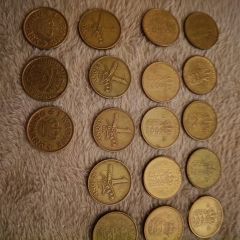 14 x 1 kroner i guldfarvet stand