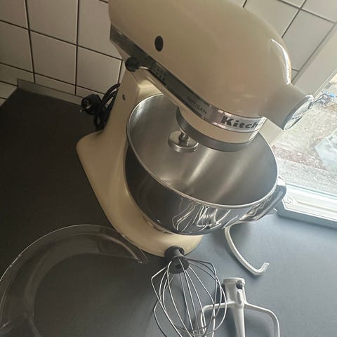 Tilbehør medfølger: Rustfri stålskål, dejkrog, piskeris, fladpisker og plastskærm.