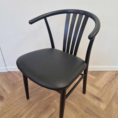 Spisebordsstol med italiensk kraftig læder i cognac med koldskum i sæde&ryg, som er med til at give stolen en behagelige siddekomfort, men som samtidig også holder sædet fast og pæn i udtrykket. Massivt egetræs stel, hvidolieret.