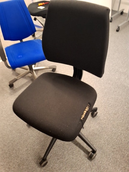 Kontorstolen fra Kinnarps har et polstret sæde og ryg. Den er udstyret med hjul og en sort base. Den har flere indstillingsmuligheder.