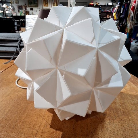 Lampens skærm er foldet og har bløde farvetoner. Foden er glat og hvid.,Afhentes i:,Røde Kors Glostrup (161),Bemærk at mail, chat og beskeder ikke besvares, og varen skal købes på knappen "Gå til varen"