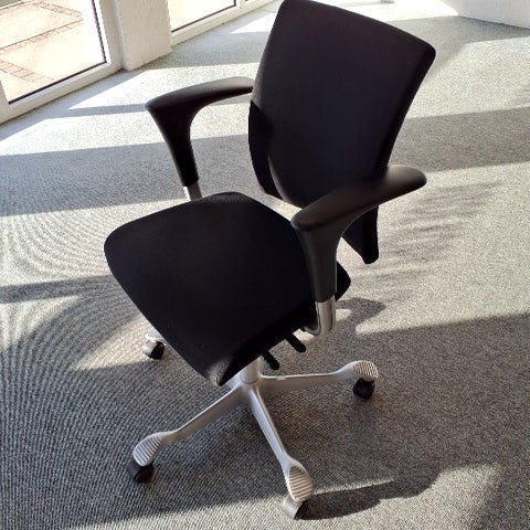 Stolen fra HÅG har en blød, blå polstring med ergonomisk form og metalramme m. 5 hjul og armlæn.