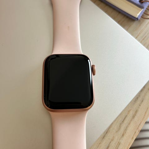 Apple Watch Series4 smartwatch med sort rem. Enheden har en firkantet skærm og er designet til at blive båret på håndleddet. Egnet til brug som aktivitets- og sundhedsovervågningsenhed samt til notifikationer og apps.