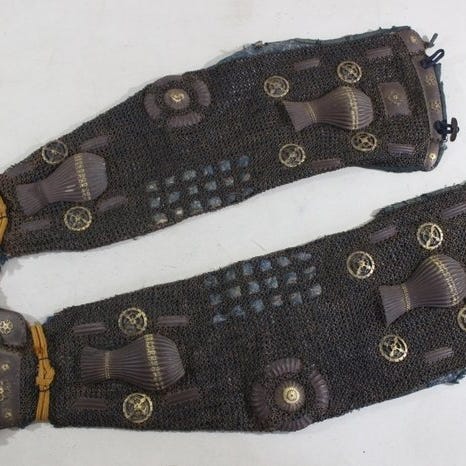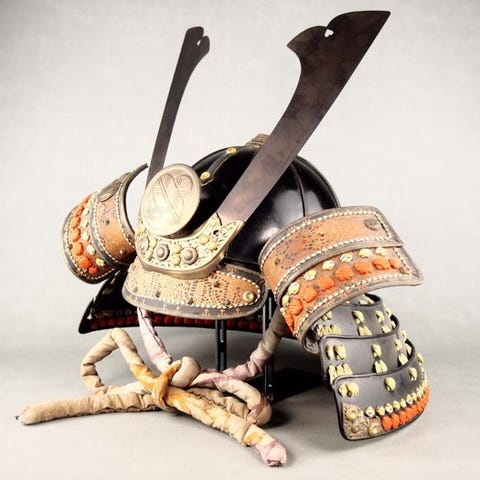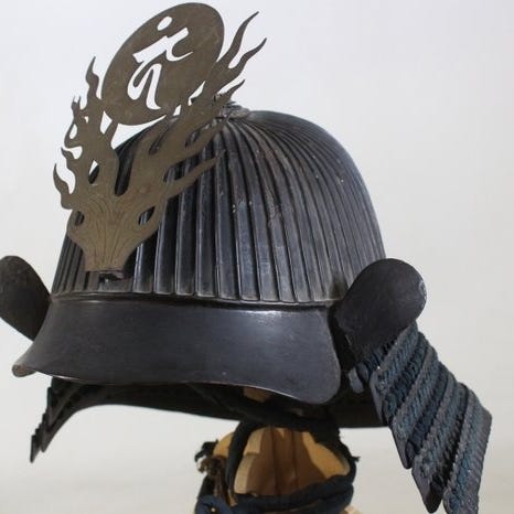 Edo-periode smedjerjern kabuto med maetate-træ, over 200 år gammel, fra Japan; sort lakkeret shikoro med gyldent familieemblem; højde 36 cm, bredde 31 cm, dybde 30 cm, vægt 2,5 kg; kommer fra et antikmarked; ikke leveret med stand; stand: Fair. Klik på den blå "gå til varen" knap, for at købe eller byde på denne vare. Den samlede pris vil blive vist inden du afgiver dit bud.