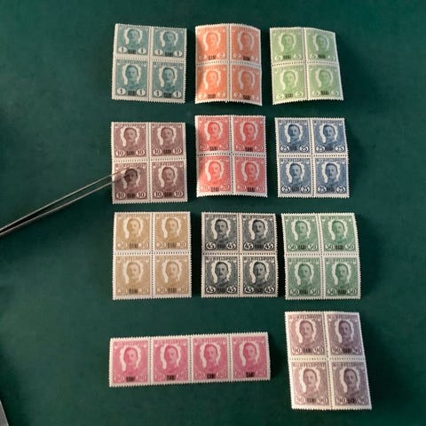 Alle frimærker uden lim som udgivet, med gode margener og på 2 frimærker med lille fortynding uden fejl.