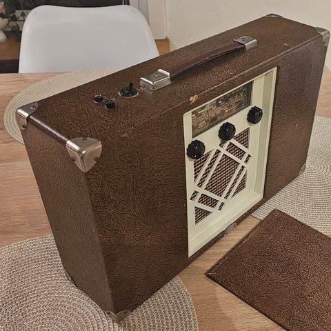 Vidor CN 396A bærbar radio, fremstillet i 1950, i ny stand og testet og funktionel, brun farve, med fjernbetjening, 4 kg, dimensioner 10 x 30 x 20 cm, serienummer CN 396A. Klik på den blå "gå til varen" knap, for at købe eller byde på denne vare. Den samlede pris vil blive vist inden du afgiver dit bud.