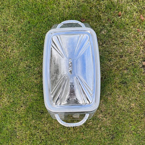 Meget smuk serveringsskål med låg i god stand (verzilveret Pyrex).