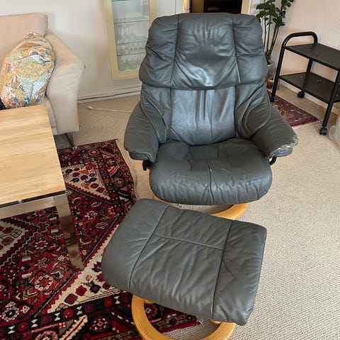 En god lænestol som er god at sidde i. den har stået i et kælderrum i et par og sølges pga. flytning. jeg har ikke præcise mål, men den fungere som en god lænestol til stuen. kan afhentes is Hellerup