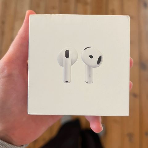 Apple AirPods 4 trådløse hovedtelefoner med opladningsetui. Designet til trådløs brug med Bluetooth-forbindelse. Leveres i hvid farve.
