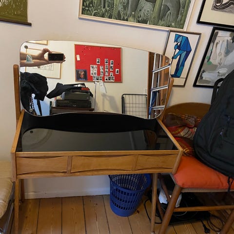 Dansk design udført af Ørum Møbelfabrik 1960’erne. Sminkebord med kipbart spejl. Fremstår i flot og velholdt stand.