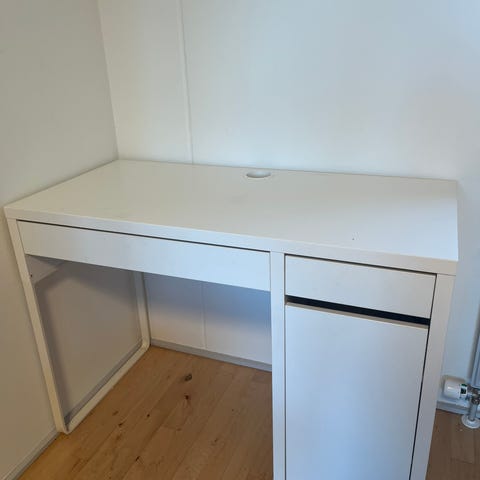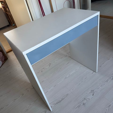 Klassisk skrivebord med praktiske hylder. Har lidt brugsspor på pladen og det ene ben (se billeder), men fungerer perfekt.