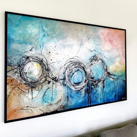 TILBUD på Abstrakt geometrisk maleri med trekantede former i forskellige pastelfarver som lyserød, blå, grøn, gul og sort. Dette abstrakte geometriske maleri består af forskellige polygonale former i blå, lilla og pink nuancer. Maleriet har en moderne stil og passer til indretning, der ønsker et kunstnerisk og farverigt element. Håndmalet af Malene Hedetoft unika malet på kanten så det ikke behøver indramning. Min hjemmmeside kan ses via instagram malenehedetoft. Tag en tur til skov og strand og kom forbi og se på det.