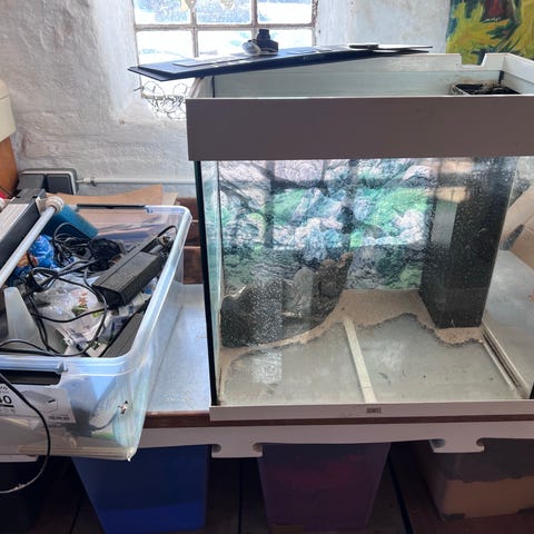 Hvidt Akvarium med tilhørende kabinet. Velegnet til opdræt af ferskvandsfisk. Leveres med lys. Passer til brug i hjem eller kontor. Medfølgende skab med 1 hylde til opbevaring.