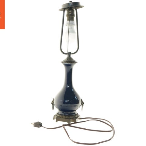 Denne vintage bordlampe har en keramisk base med en hvid glans, der giver et klassisk udseende. Den har en metalramme øverst, som holder fatningen til pæren, men manglede en skærm. Lampen har en gammel ledning med en europæisk stikprop. Der ses brugsspor på metaldelene og basen, hvilket giver lampen et retro look af ældre design. Lampen er 55 cm høj og vil være perfekt som en del af boligindretning med et nostalgisk præg.