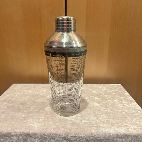 En rustfri stål cocktailshaker med en højde på 19,5 cm. Shakerens design inkluderer en udskiftelig top med en indbygget si. Den har en dekorativ kant rundt om midten og viser nogle brugte tegn. Ideel til at blande cocktails hjemme eller i en bar.