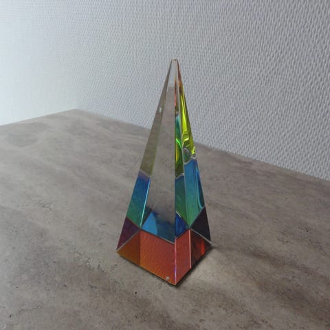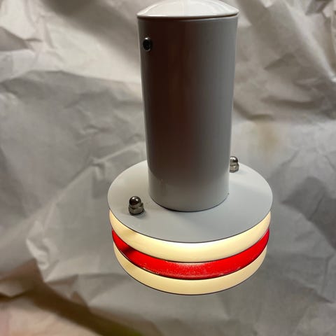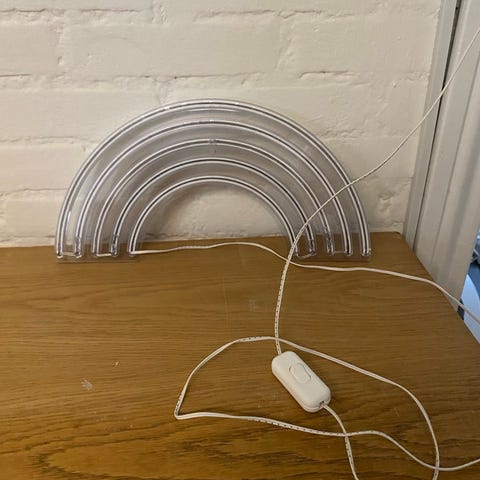 Dette er en regnbue projector lampe med en unik buet design. Lampen er hvid med blå kanter og har en regnbue stribe på siden. Den er designet til at projicere regnbue farver, hvilket kan skabe en magisk atmosfære i rummet. Der er en tænd/sluk-knap vist på en af billederne. Størrelsen på lampen er 23 cm.