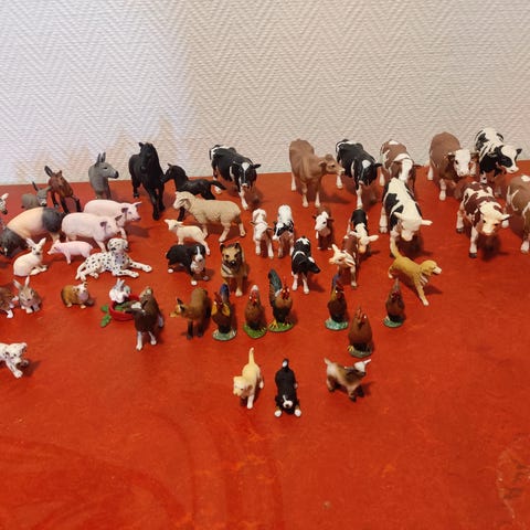 Schleich Dyr Figur Sæt bestående af forskellige bondegårdsdyr inklusive ko, hest, fåre, kalv, hund og kanin. Figurerne er detaljerede og velegnede til leg eller samling.