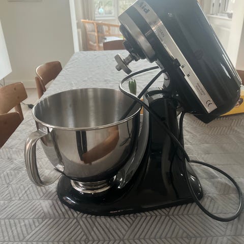 KitchenAid Artisan køkkenmaskine i sort farve. Maskinen har en robust konstruktion og er designet til alsidig brug i køkkenet til blanding, æltning og piskning. Modellen har en klassisk stil og er udstyret med en motor, der kan håndtere forskellige typer af dej og ingredienser.