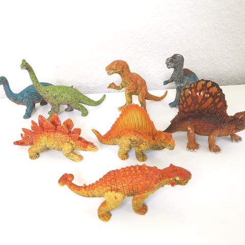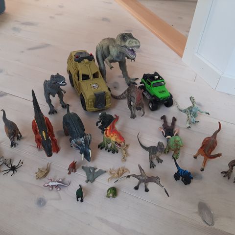 Mange forskellige dinoer, vilde dør, køretøjer, osv.