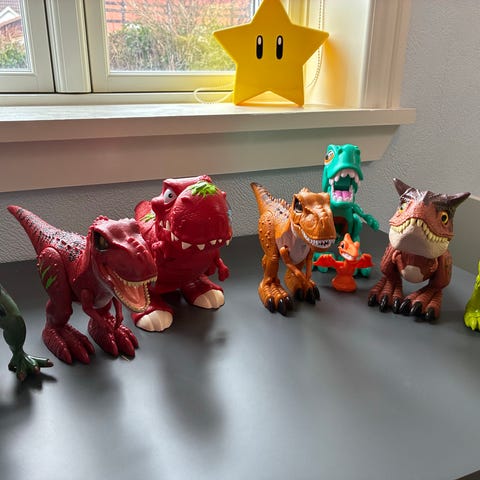 Sortiment af dinosaurer, action-figurer og køretøjer