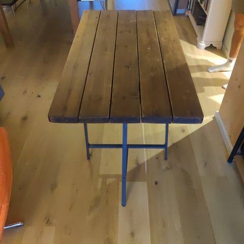 Smukt bord i mørkt træ, få brugsspor som eventuelt kan fjernes ved let slibning og en gang olie. Skal selv bæres ned fra 4. Sal.