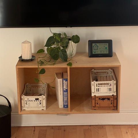 Reol bygget af kasser, formentligt fra Trævarernes Fabriksudsalg.