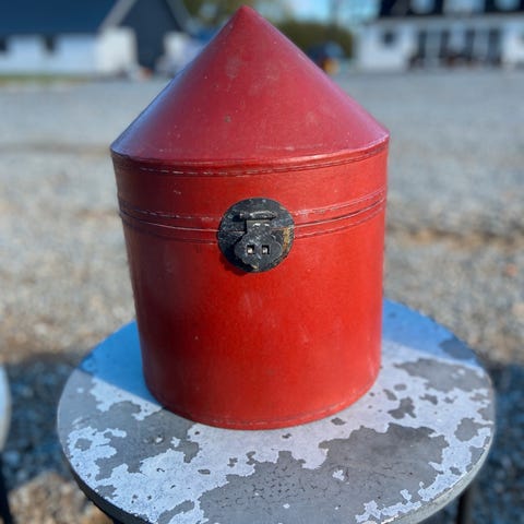 Kinesisk antik hatteæske bl.a. brugt til transport af hat - h 30 cm d 35 cm i meget fin stand 450 kr