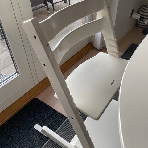 Stokke højstol til børn med hvid sæde og bakke samt ben i lyst træ.