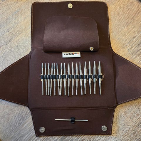 Addi Click strikkepindesæt med udskiftelige spidser og kabler. Sættet inkluderer flere størrelser af metalspidser og fleksible kabler, opbevaret i en sort stofmappe. Velegnet til strikning af forskellige projekter med mulighed for at tilpasse længden efter behov.