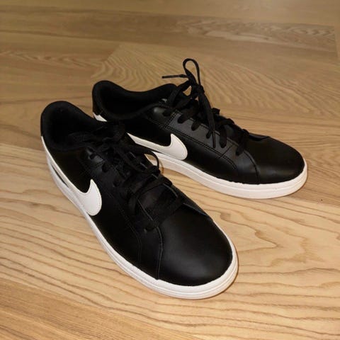 Nike sneakers i størrelse 45. Skoene er i sort og hvid farve med snørebånd og polstret ankelstøtte. Egnet til daglig brug og fritid.