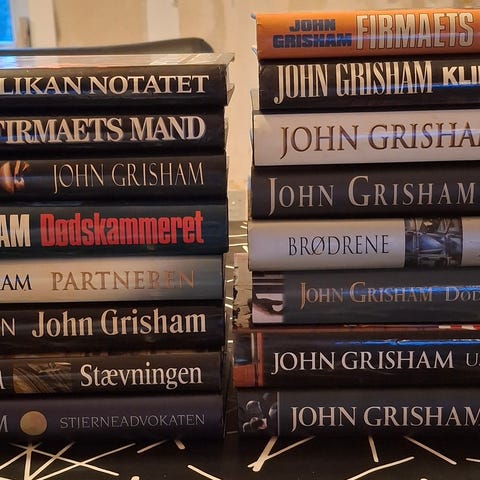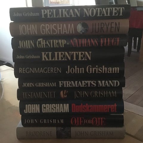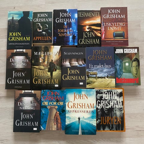 John Grisham bøger inklusive titlerne The Testament, The Broker, The Runaway Jury, The Rainmaker og The Firm. Forskellige romaner inden for juridisk thriller-genre. Bøgerne er på engelsk og findes i paperback-udgaver.