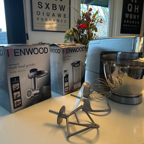 Kenwood Major classic køkkenmaskine med rustfri stål skål og flere tilbehør som piskeris, blender, at950b kødhakker og diverse skiver. Maskinen er designet til alsidig madlavning og bagning.