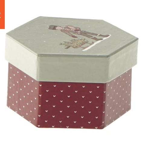 En dekorativ metalæske med julemotiver, inklusive juletræer og stjerner. Æsken har et aftageligt låg og en oval form. Den er primært rød med grønne og gyldne detaljer, og den måler 13x7 cm. Perfekt til opbevaring af små genstande eller som en del af juledekorationen.